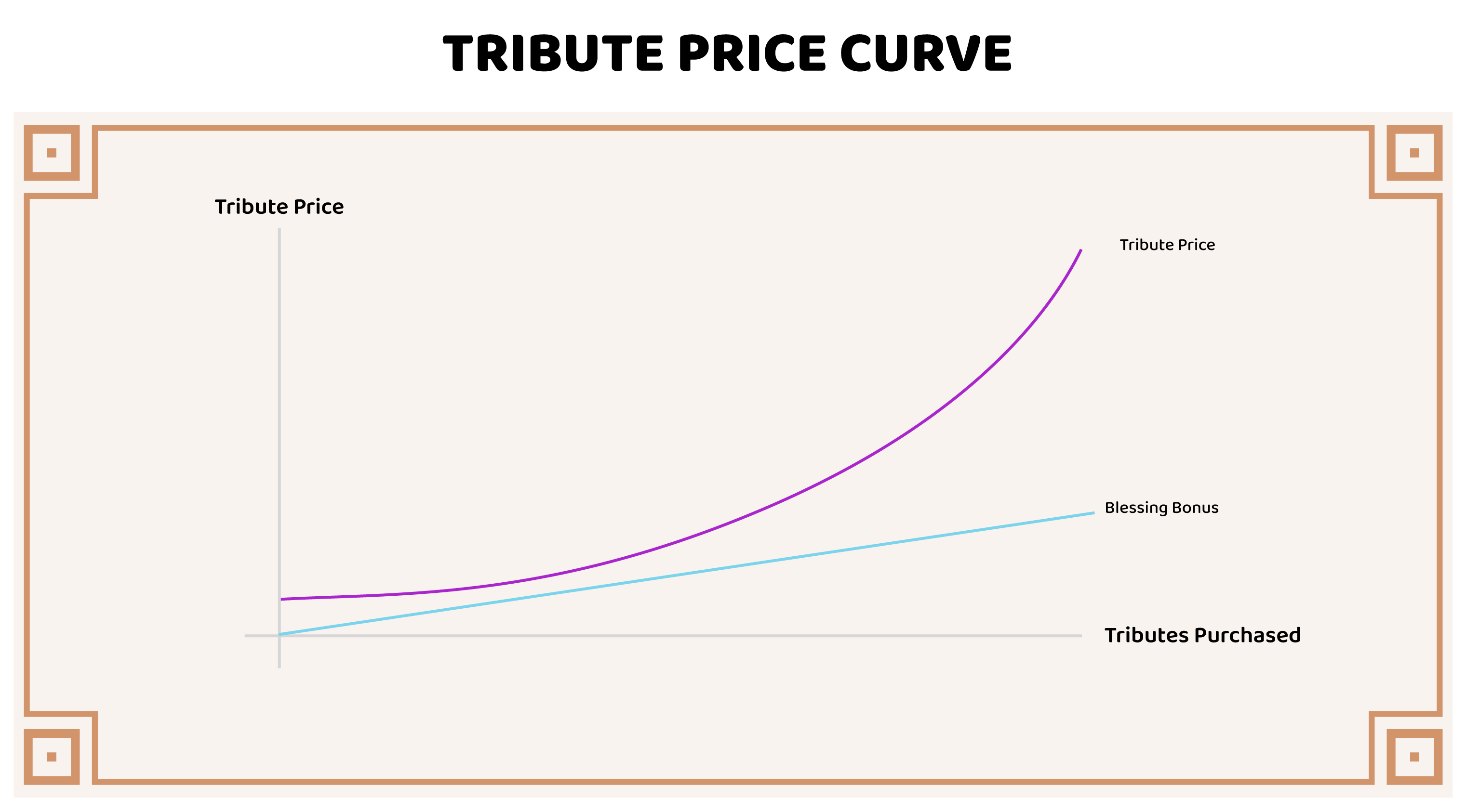 **The effects of Blessings increase as Patrons purchase Tributes**, with each subsequent Tribute being more expensive and further enhancing the benefits of a Blessing. The price of Tributes grows in accordance with bonding curve mechanics.